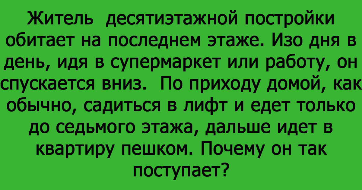 Житель десятиэтажной постройки обитает на последнем этаже. Изо дня в день, идя в супермаркет или работу, он спускается вниз. По приходу домой, как обычно, садиться в лифт и едет только до седьмого этажа, дальше идет в квартиру пешком. Почему он так поступает?