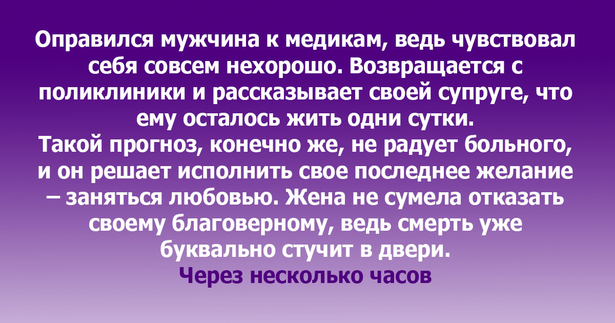 После любовных утех мужчина ложится спать и вдумчиво смотрит в потолок. Переводит взгляд на часы и осознает, что жить ему еще 5 часов. Он начинает гладить и соблазнять супругу.