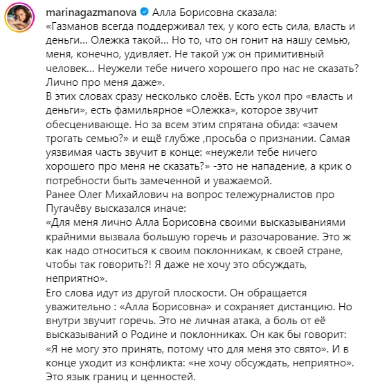 Поклонники встали на сторону Марины и отметили, что Газмановы на голову выше Примадонны, поэтому нет смысла встревать в этот конфликт. Но в комментариях есть и защитники Пугачевой, которые считают, что она абсолютно права.
