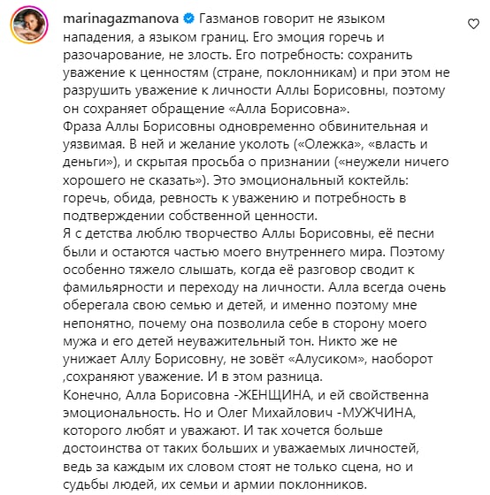 Естественно, Марина Газманова решила высказаться, чтобы защитить мужа в публичном пространстве. Она отметила, что Алле Пугачевой пора работать над лишней эмоциональностью. У нее совсем нет чувства достоинства, хотя ранее, по мнению супруги певца, Примадонна была уважаемой личностью.