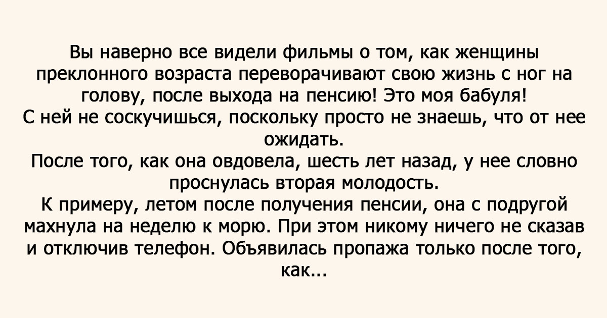 Вы наверно все видели фильмы о том, как женщины преклонного возраста переворачивают свою жизнь с ног на голову, после выхода на пенсию! Это моя бабуля!