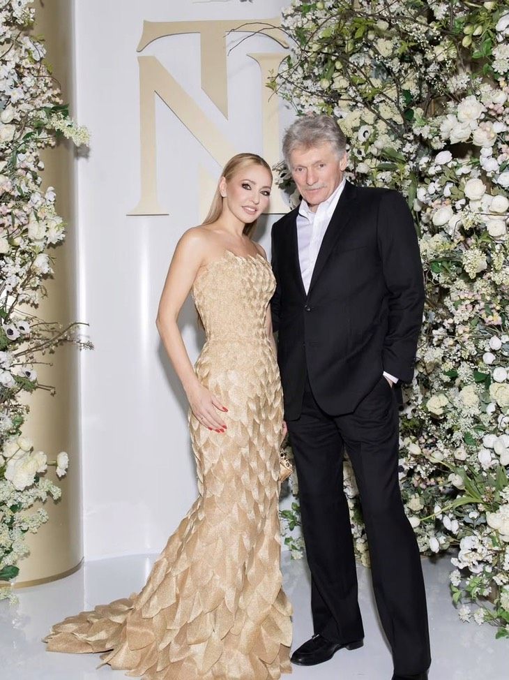 На снимках она предстала в эффектном золотом платье с корсетным верхом и длинным шлейфом, украшенным золотыми лепестками. Этот образ выгодно подчеркнул ее стройный силуэт. Навка распустила волосы и дополнила образ ярким вечерним макияжем. На одном из кадров спортсменка позировала вместе с супругом Дмитрием Песковым.