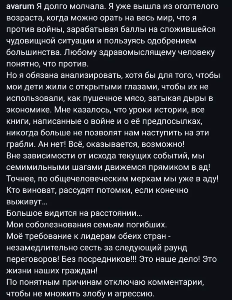 После такого громкого высказывания Анжелика Варум перестала выходить на связь. Также певица не давала концерты и никак не комментировала происходящее в мире.