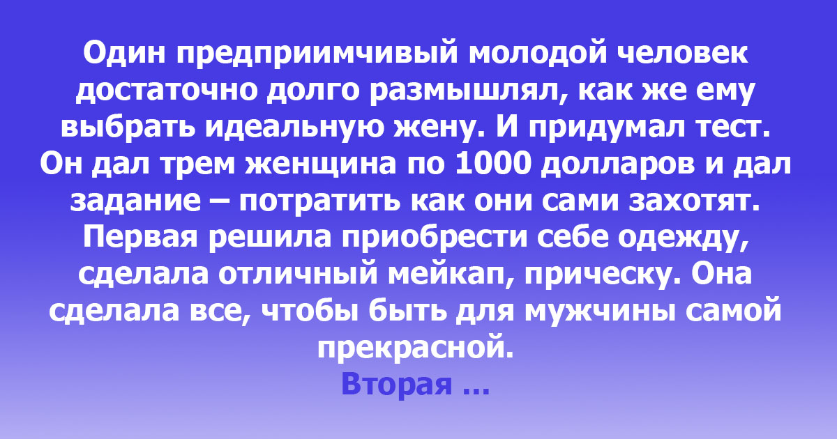 Один предприимчивый молодой человек достаточно долго размышлял, как же ему выбрать идеальную жену. И придумал тест. Он дал трем женщина по 1000 долларов и дал задание – потратить как они сами захотят.