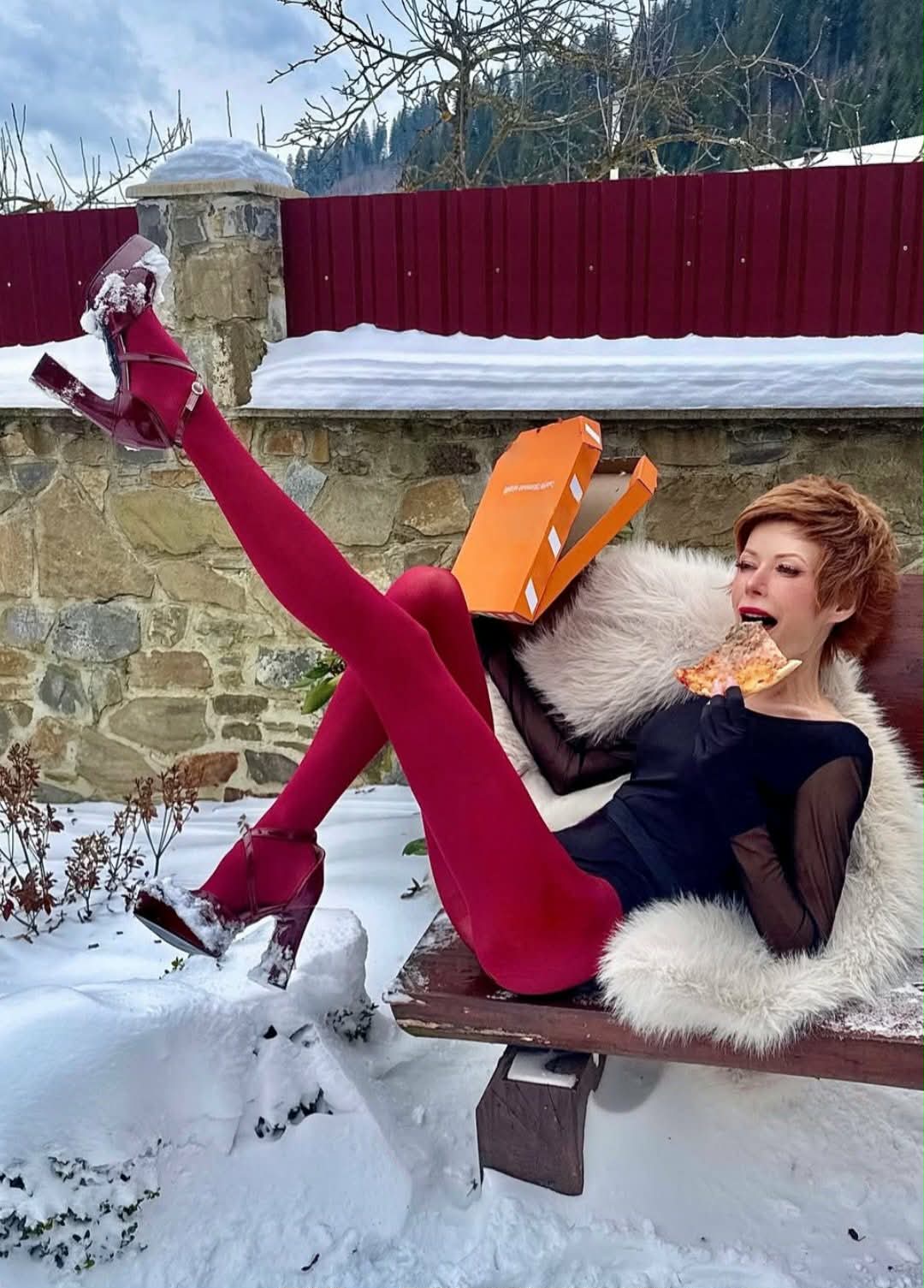 Украинская ведущая, вес которой едва достигает показателя в 40 кг, продолжает будоражить зрителей. В этот раз она появилась в одном купальнике на морозе, да и еще с топором в руках. Образ Лебедь дополнила обувью на каблуке, которая совсем не подходит для снежной погоды. Елена-Кристина частенько устраивает такие провокационные фотосессии, тем самым вызывая к себе усиленное внимание.