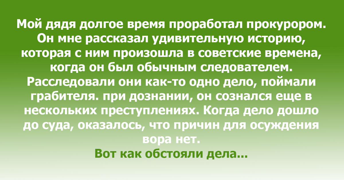 Мой дядя долгое время проработал прокурором. Он мне рассказал удивительную историю, которая с ним произошла в советские времена, когда он был обычным следователем. Расследовали они как-то одно дело, поймали грабителя. при дознании, он сознался еще в нескольких преступлениях. Когда дело дошло до суда, оказалось, что причин для осуждения вора нет.