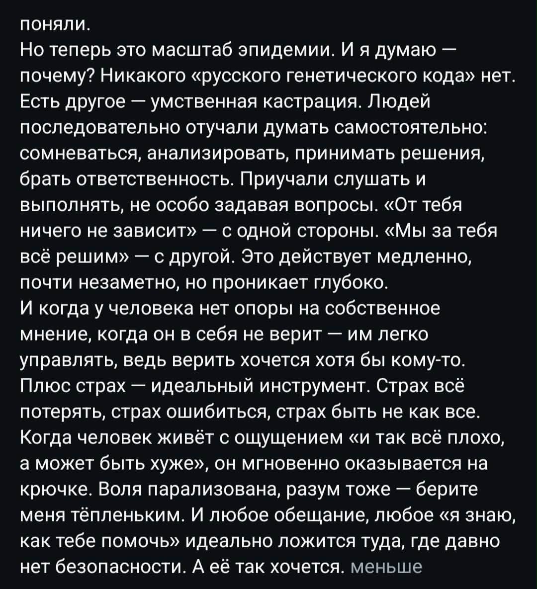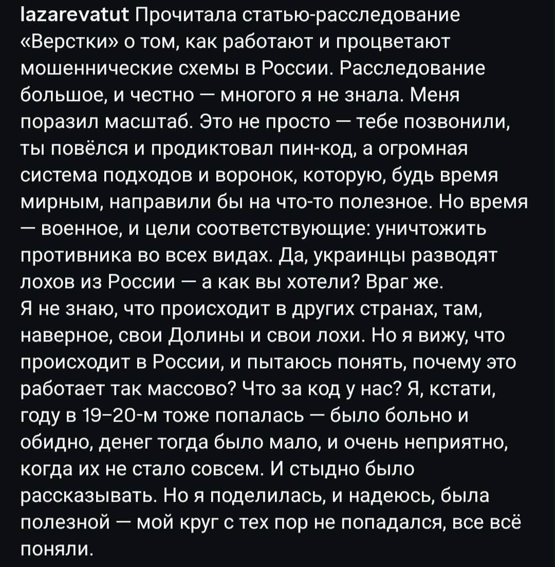 Особое внимание актриса уделяет народу своей страны, считая, что граждане часто не умеют мыслить критически и принимать самостоятельные решения. Лазарева утверждает, что массовое следование за внешними авторитетами и неспособность делать обдуманный выбор приводит к повторению одних и тех же ошибок на протяжении десятилетий. По её мнению, именно пассивность и недостаток гражданской ответственности создают условия для закрепления власти, которая действует вопреки интересам общества.